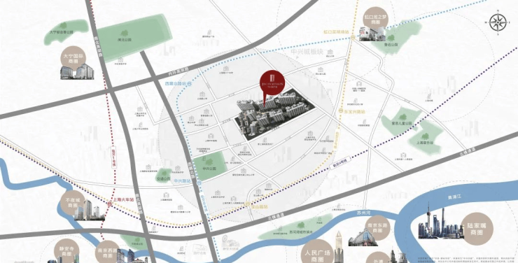 占位静安发展主轴之上,中兴社区周边核心商圈林立,直接对望苏河湾CAZ。