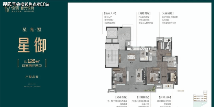 1. 126 ㎡、143㎡四房户型 南向阳台面宽分别达9米、9.3米 ,少有的三开间南向阳台。