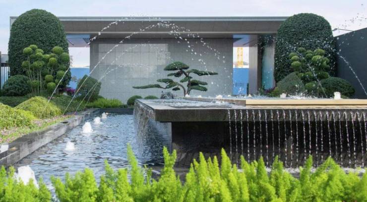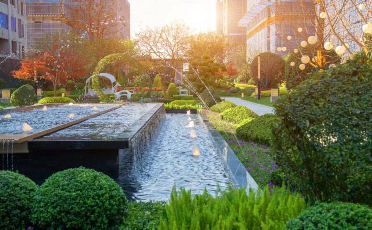 中央水景如镜,静谧深邃,当夜幕降临,水中点点灯光,如繁星坠落人间。
