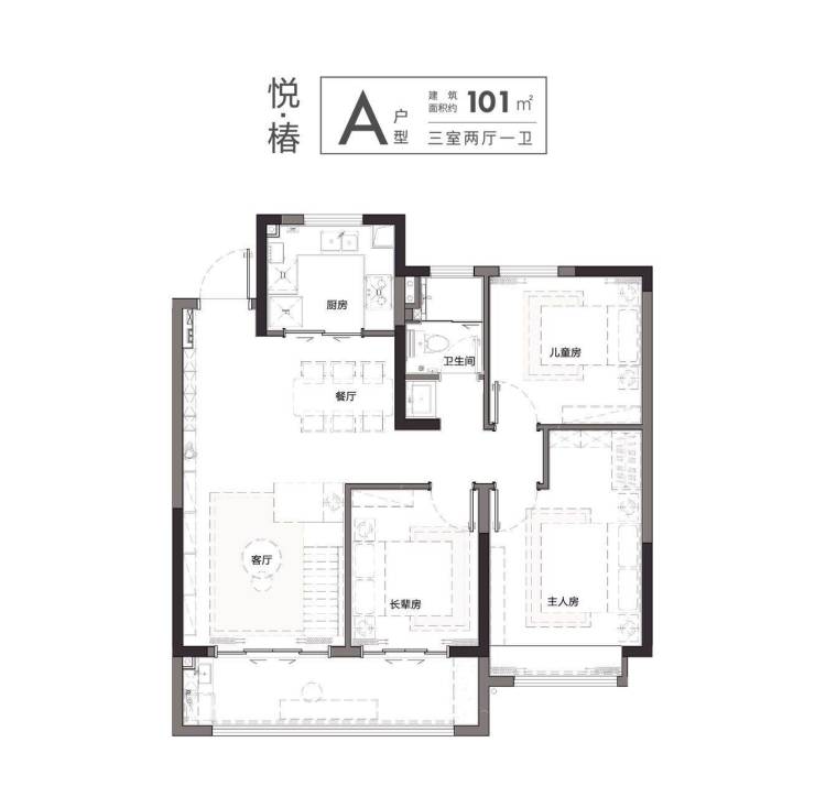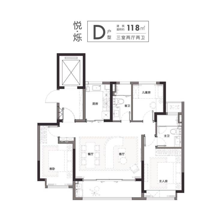 连通双阳台、超配主卧约12㎡、餐客厅分布合理、没有过道、三段式卫生间干湿分离