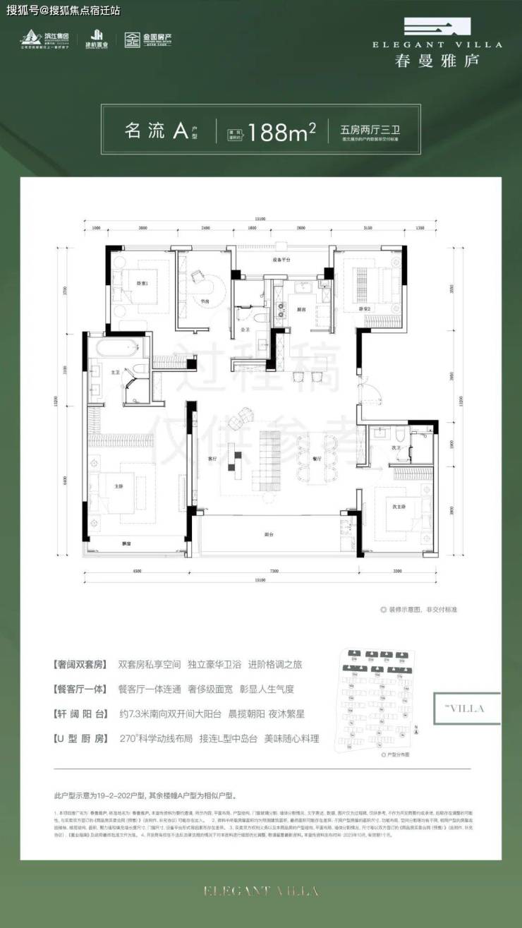 以建面约188㎡的五房为例,四开间朝南的大面宽的排布,南向开间超过15米,7.3米的超大餐客厅外接跑道式阳台,搭配巨大的落地窗,既有三代同堂的其乐融融、亲朋好友欢聚的温馨浪漫,又有客厅、茶室、餐厅等等无数种空间的个人组合,生活充满无限想象。精装修上,芬迪白岩板的客厅背景墙,中厨外的实用岛台等全是交标,品质感直接拉满。