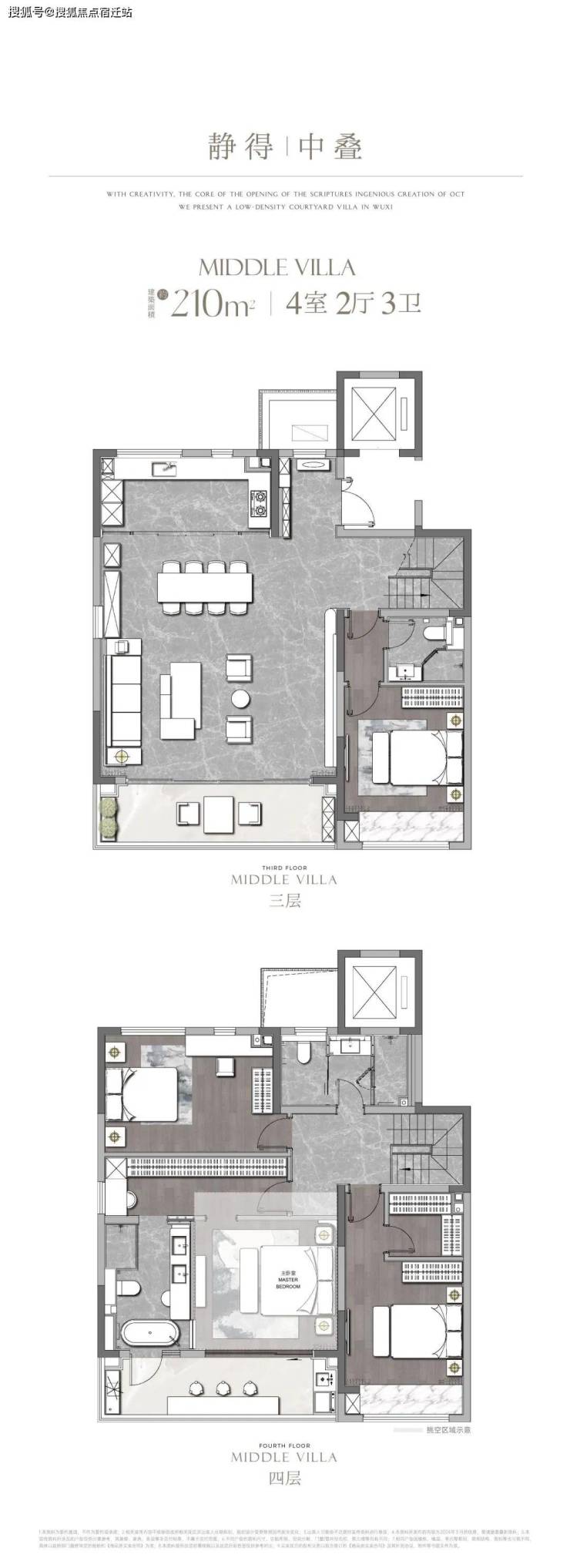 下叠【院隐】户型建面约310㎡,4室2厅4卫的三层院墅,地上六开间朝南,地下约5.2米挑高空间打造近100㎡私人会所;一楼超大南向度假式庭院与客厅相通,近50㎡全龄社交会客厅,采光视野媲美大平层。