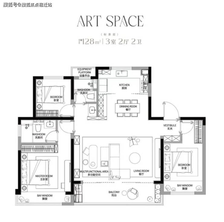建面约128㎡三房两厅两卫户型,设计师将客厅、餐厅及厨房全都融为一体,做了开放性的布局,四开间朝南,约6.6米开间的宽厅连通阳台,南北通透,保证了充足的采光。主卧套房设计,满足高端人群对居住空间的挑剔需求。双卫设计,更具隐私性,规避了一房三代同堂的困扰。