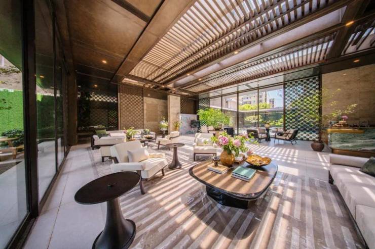 入户门庭,宛若城市桃源巨幕画境,“十三折”屏扇莲庭,取意中国长卷画幅13: 1宽高比,一如富春山居图彰显世家风雅。甄选每⼀块透光奢⽯的纹理,形成如同中国山水画的肌理质感,营造当代文化审美。罗汉松造景,寓意东方人文精神与美好生活。