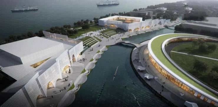 园区采用“围合式”布局,融合“钱塘江”水韵灵感,映衬周围自然生态,配合全冠移植的特色名贵树种,营造出环景畅谈式“艺术公园”。