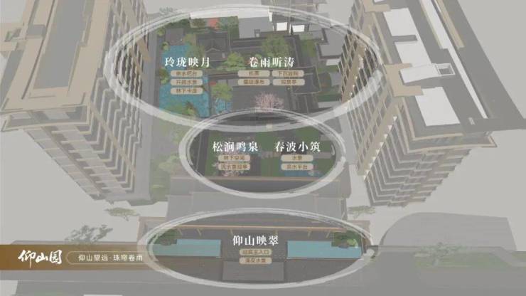 匠心营造东西双园意境。西区仰山园以“三进五园九景”之制;东区春熙园取法点春堂意境,以“两轴两巷三园"为序,融汇幽深与开阔。