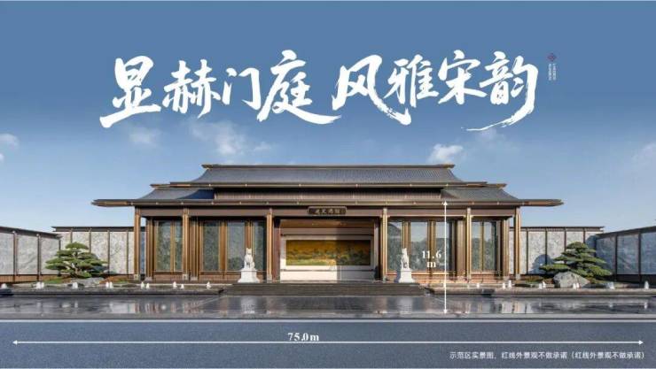 大门建筑灵感取意宋徽宗《瑞鹤图》,打造宋氏双重飞檐,轻盈飘逸,大门含两侧景墙总长约 75 米,中间五级汇龙阶,两侧造型松迎客,门旁两只麒麟镇宅,祥瑞之气萦绕,更邀非遗大师亲绘《千里江山图》漆画于门厅,归家即入画。