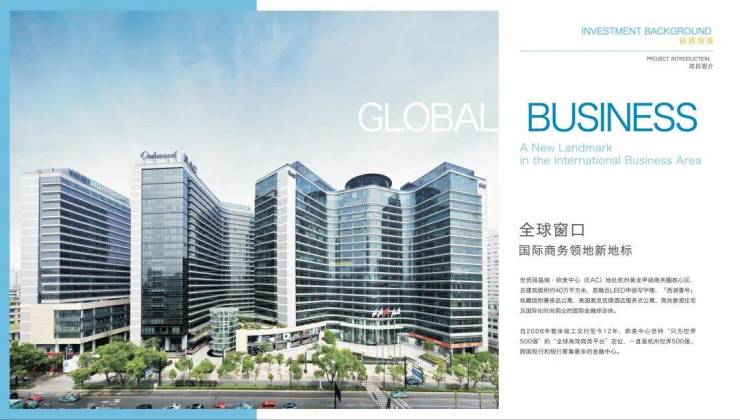 EAC欧美中心地处杭州黄龙甲级商务区核心区,总建筑面积面积40万平方米,是融合LEED甲级写字楼、「西湖壹号」收藏级别奢侈品公寓、美国奥克伍德酒店服务式公寓、高层景观住宅及国际化时尚商业街区的国际金融综合体。