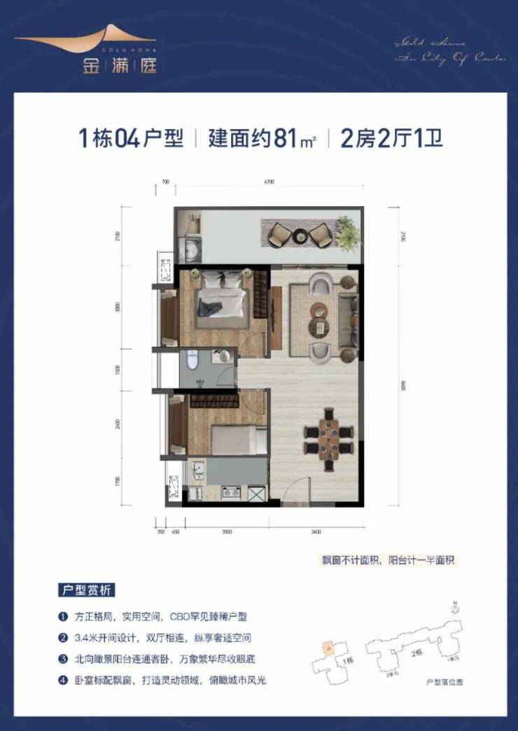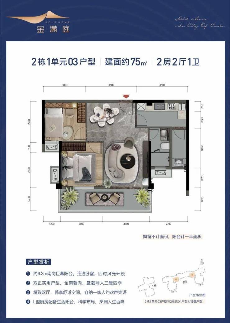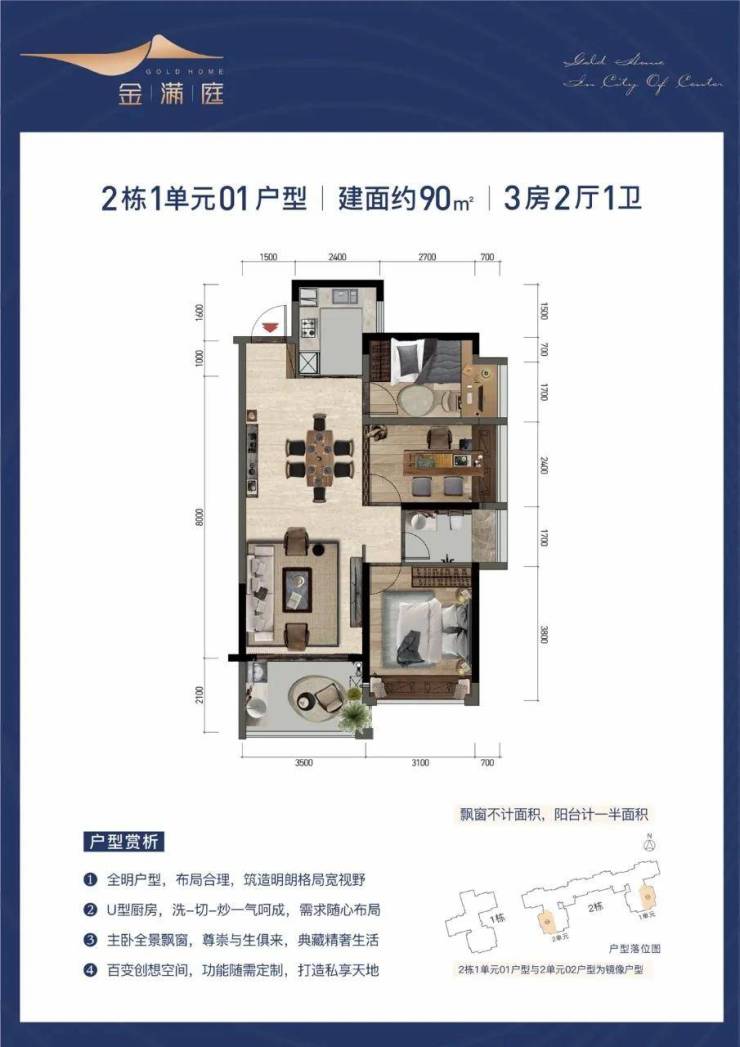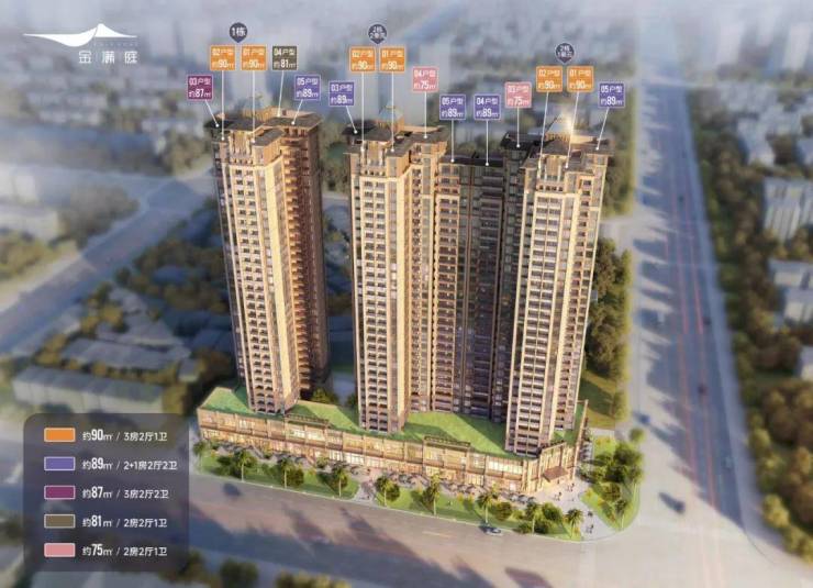 金满庭在售栋数为1栋、2栋(共3个单元),产品面积75-89-90㎡,层高33层(二楼商业,三楼起算),梯户数两梯五户,车位:323个。