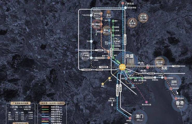 通过庆盛站搭乘广深高铁,9分钟到东莞虎门、30分钟到深圳北、35分钟到西九龙。