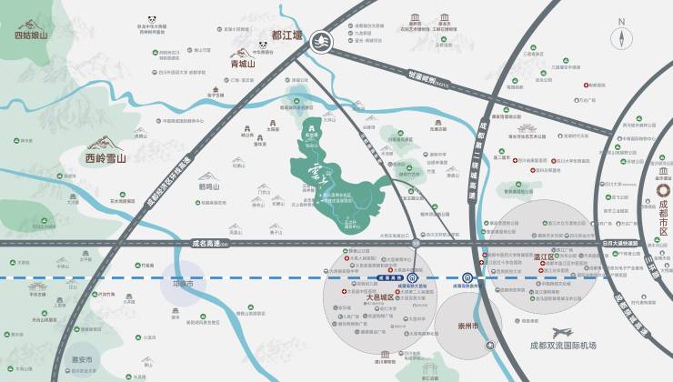 项目位于成都以西48公里,川西旅游环线核心板块大邑县青霞镇,青城山、西岭雪山、烟霞湖、街子古镇、安仁古镇……