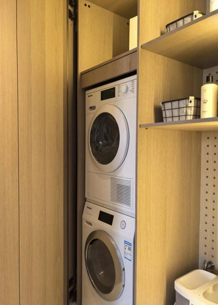 北次卧门外设有一个家政空间,深度超过60厘米,内含洗烘套件及大量收纳空间。采用隐形门设计,既实用又兼具美观。