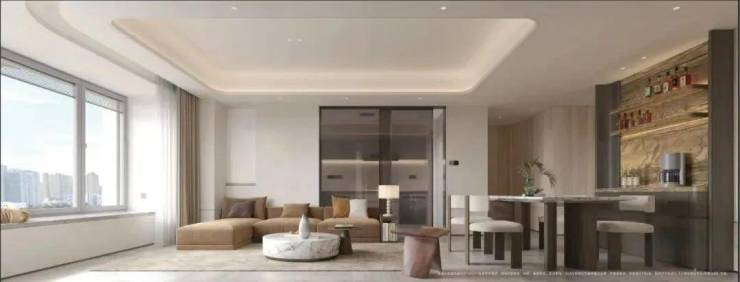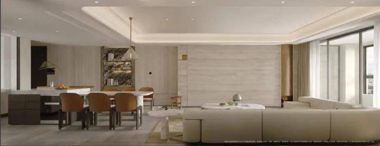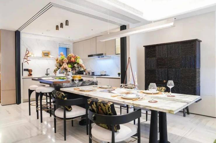 餐厅内设有尺寸大约为1.2米乘以1.5米的岛台,采用天然奢石威尼斯棕材质,这同样是交付标准!