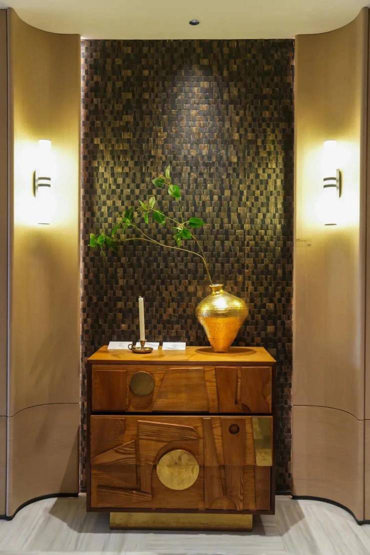 进门之后正对艺术玄关,背景为威尼斯棕石材(交付),在两侧设置弧面半包裹造型(交付),给到满满的归家仪式感。