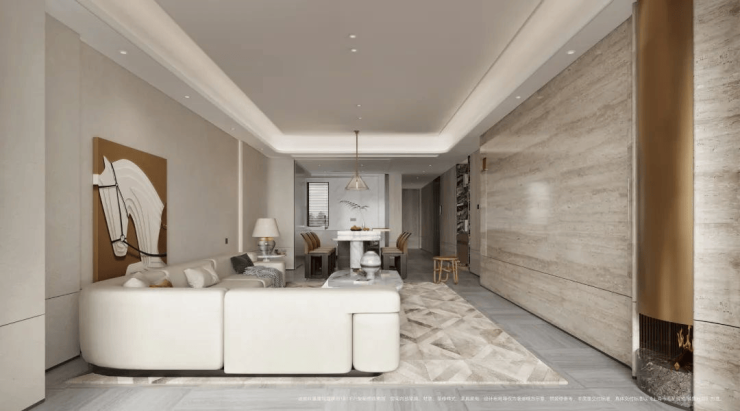 在客厅内,电视背景墙采用了进口的米色石材,其设计为弧形,加工难度极大,耗时是常规石材的三倍。此外,旁边的壁龛也包含在交付范围内,既实用又美化了空间。