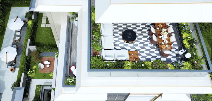 下叠带南向院子、中叠带北向院子、上叠带屋顶整层露台的均衡价值,且上中下叠互相看不到对方的院子和露台,确保私密性。