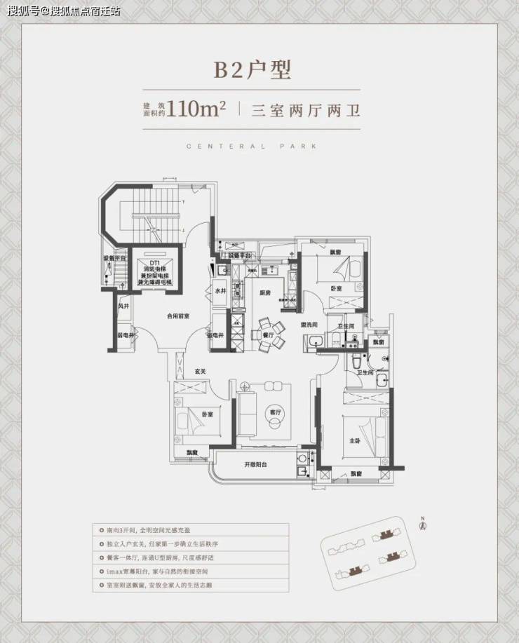 建面约110㎡中间套竖厅户型,同样也是标准的南北通透飞机户型,整体室内的采光、尺度感、通风都相当出色。非常适合一家三口、年轻夫妻的全生命周期需求!