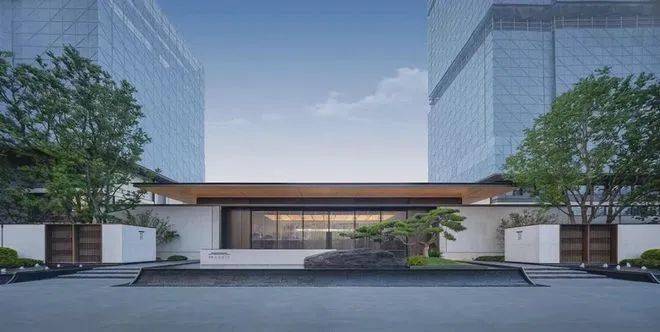 塔冠设计将中式屋檐与现代极简美学相融合,呈献极简东方的大美意象。外立面以昆石同色石头,搭配现代铝材、高透玻璃,焕新城市人文天际线。镂空金属、木纹铝板、错缝石材拼接,精奢演绎山水纹理,于细节处呈献精微与宏大的东方造物之境。