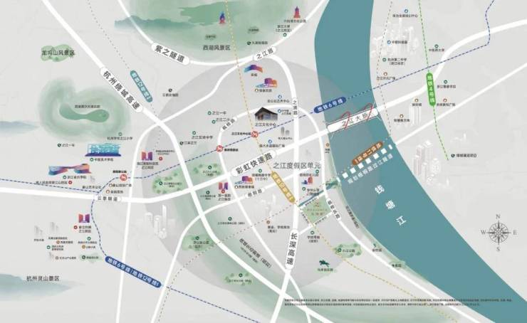 本案站位之江度假区板块核芯,北接西湖景区,东望钱塘江,主城多区域资源在此汇集。 紧邻枫桦路环线,串联之江核芯配套,虹吸效应尽显。