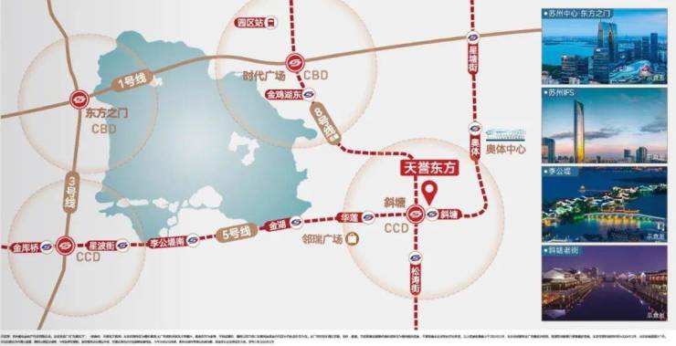 双轨交汇 黄金四角环湖四轨交汇,缔造金鸡湖黄金四角,西北-东方之门、东北-时代广场、西南-李公堤、东南斜塘老街一黄金四角所在核芯价值所向。