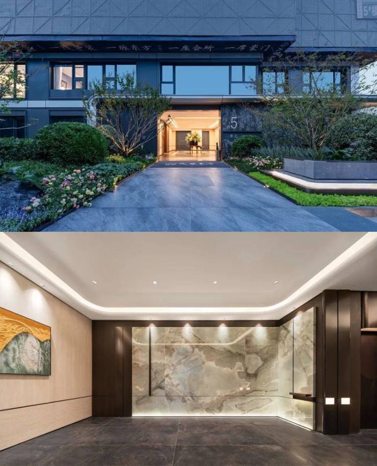 单元门臻选名贵石材搭配香槟金铝板,入户大堂精选翡翠绿岩板,定制3D圆弧吊顶,墙面局部仿木纹铝板铺贴,辅以透光云石导引,电梯轿门金属蚀刻雕纹(仅一层和负一层配置),高定精奢入户大堂。