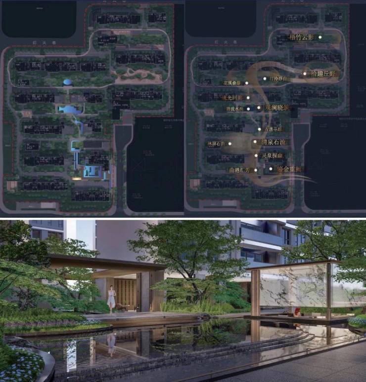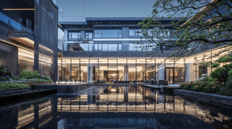 山水入画营造下沉式中央庭院 ,约12米飞流星瀑,臻选蓝翡翠奢石打造银河水境,百年丛生乌桕封藏四季风景,邀山水融自然,一方东方禅意画境