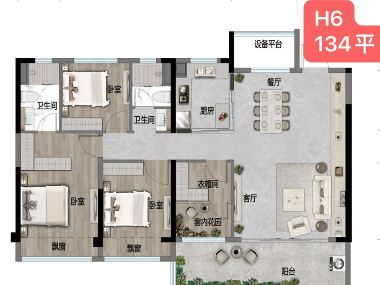 主力户型96-173㎡,得房率高,三开间朝南,部分户型带270°环幕视野、地暖及新风系统。