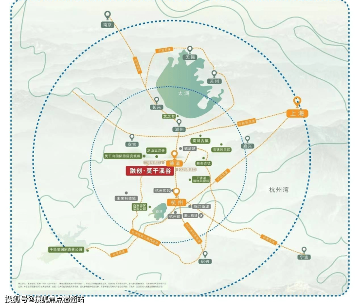 沪杭都市圈中心 旅居目的地莫干溪谷位于德清县,莫干山东麓,沪宁杭黄金三角中心。与杭州武林广场直线距离约45公里,与上海虹桥机场直线距离约146公里,以便捷交通、秀丽山水成为长三角高净值人群的旅居优选。而莫干山作为《纽约时报》公认的“一生必去的45个地方之一”,既与城市大都会保持着恰到好处的距离,又保留了自然的宜居氛围。交通便利,四通八达乘坐高铁到杭州东站只需要约13分钟,走高速到达杭州南庄兜出口直线距离26公里,距离杭州奥体中心直线距离约45km,杭州绕城高速西复线湖州段(以下简称二绕)已建成使用,无缝对接杭州未来科技城;104国道德清段(德杭快速路)无缝对接良渚板块和杭州城西板块。日前,杭州至德清市域(郊)铁路工程可行性研究报告正式获批。未来,市域铁路将与杭州地铁10号线同台换乘,实现德清与杭州中心城区一小时内直达。