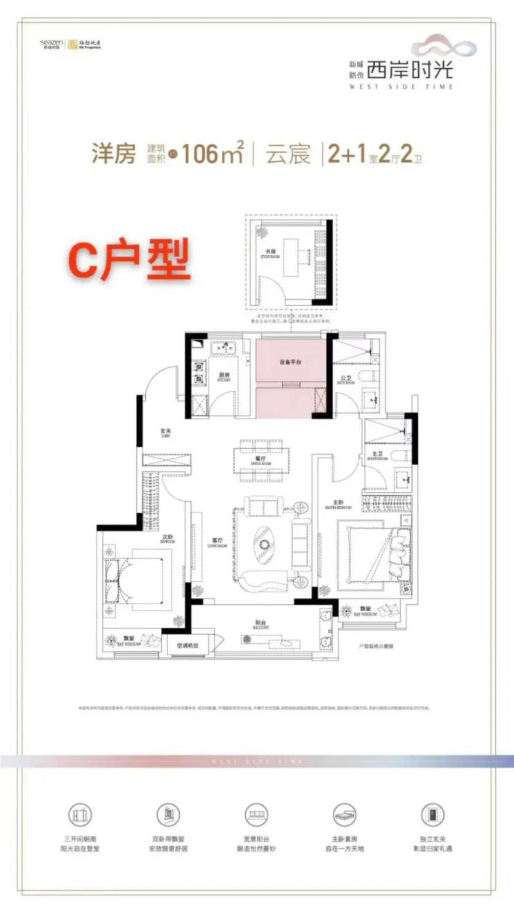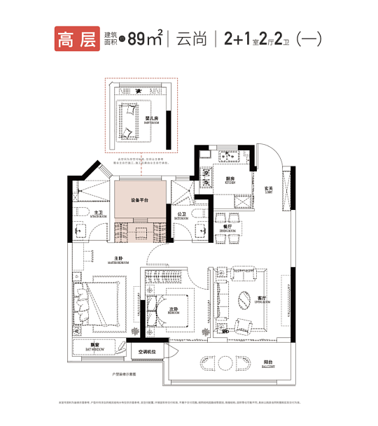 小高层:89㎡(2+1室2厅2卫)、106㎡(2+1室2厅2卫),双阳台设计,部分户型可改造为三房,得房率较高。