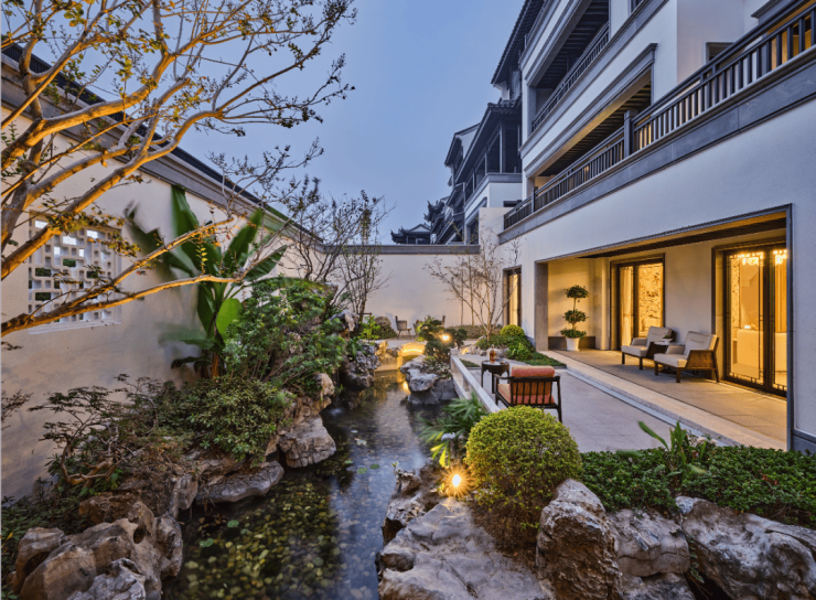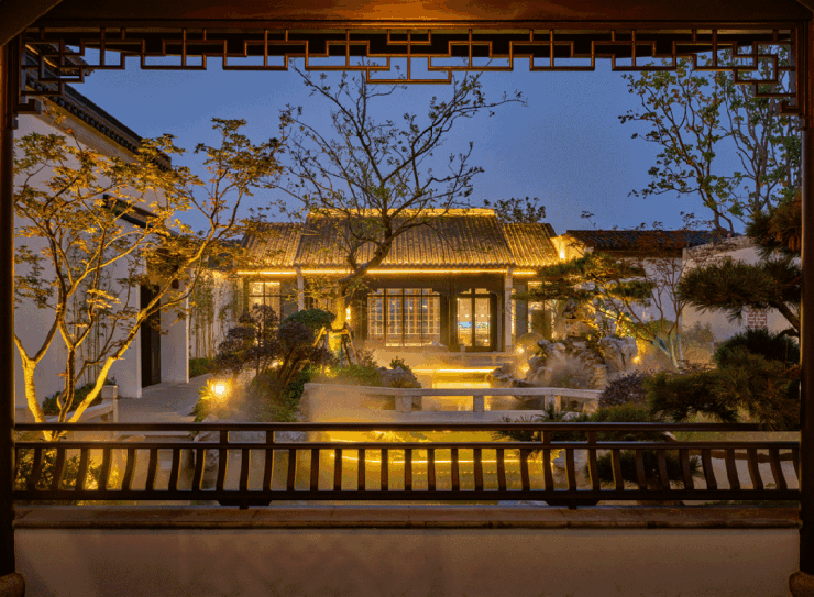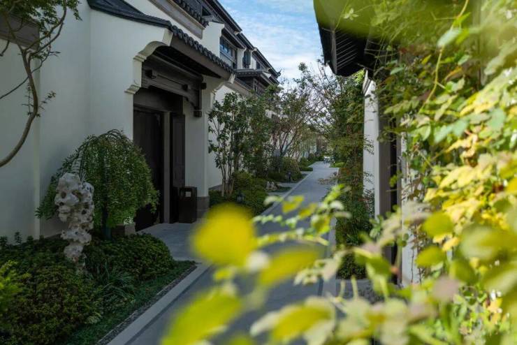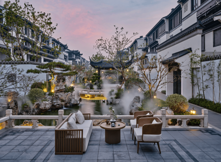 中式园林的造景工艺渗透到每个角落,设计团队充分提取了古镇水乡、吴江八景、诗词歌赋等本土文化的精髓,在每个角度看到的精致都是不同的。