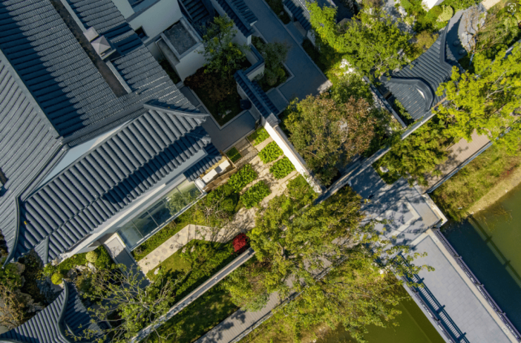 很多低密住区,你会发现内部建筑和景观有很强的边界感,建筑就是建筑,景观就是景观,而春风湖滨的植被和山石的高浓度渗透到每一处,最终造成的效果就是从空中俯瞰,建筑和景观融为了一体。