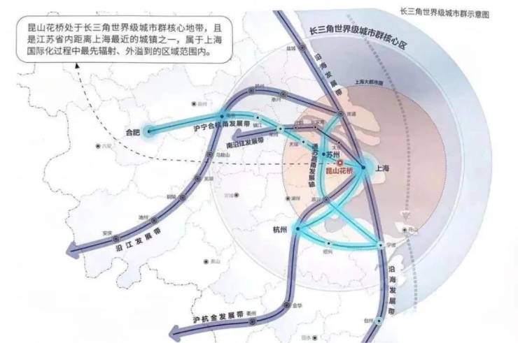 2021年2月,在国务院批复的虹桥国际开放枢纽“一核两带”功能布局中,昆山被纳入以虹桥商务区为起点延伸的北向拓展带。花桥将打造成为虹桥国际开放枢纽北向拓展带的战略支点和核心节点,让花桥与上海的联系更加紧密。