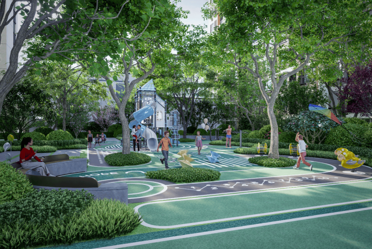 社区内部打造“森系·温馨生活花园”,采用五重园林绿化体系,通过全冠移植林木、景观置石点缀,打造了一个个相互交融、相互包裹、可停留的林下休闲空间。