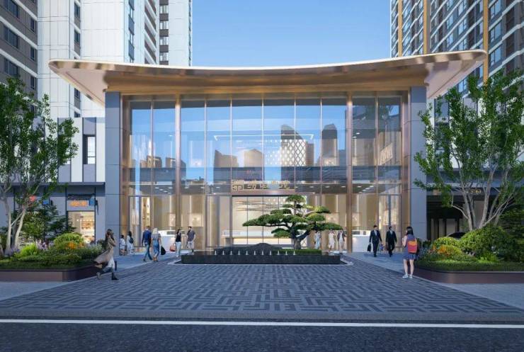 项目社区大堂采用酒店式入口门廊,27米挑檐水平横向延展 ,形状犹如白鹭亮翅,精选香槟金,配上4.0米高电动平开门,大尺度入口超白玻玻璃,彰显品质和尊贵的仪式感。