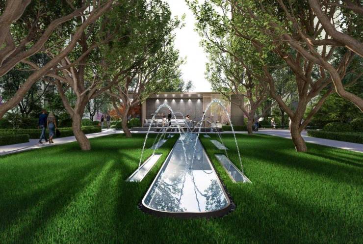 整个园林景观按照“一心、一轴、两园、四点”布局,打造约300㎡中心景观会客厅及200米中央景观轴,联动社区入户、单元入户的奢阔场景,营造出仪式府门-沐林幽静-中央花园-林间逸趣-迎门礼境五重归家体系,品质感彰显。