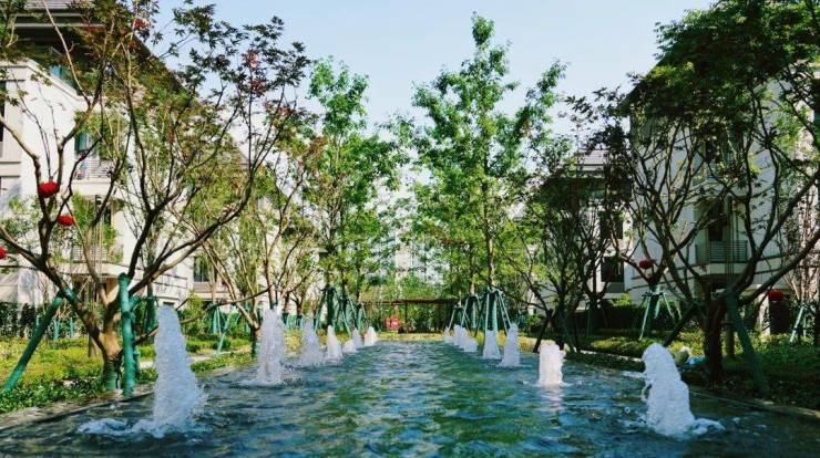 其次是园林景观的实景呈现,复地·星愉湾园区以“伴水而居,都市度假”为设计理念,百米艺术归家大道承载着静谧而丰盛的艺术生活场景。