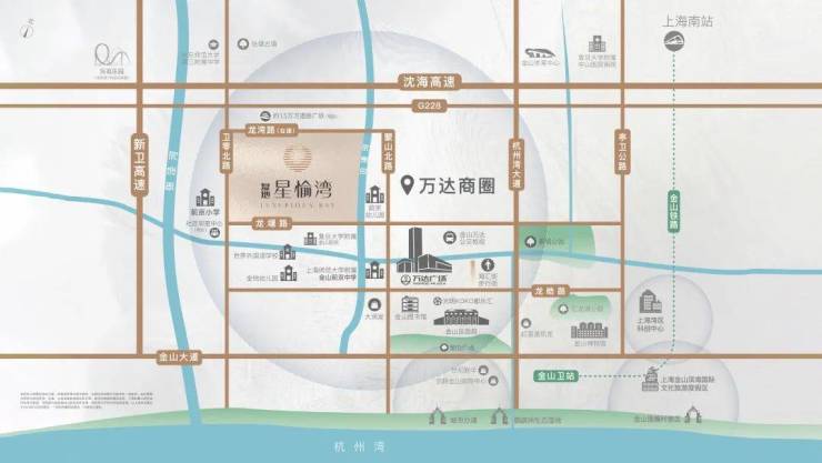一是密集的「核心商圈资源」,复地星愉湾地处新城繁华地段,直线距离约700米就是约20万方的金山万达广场。