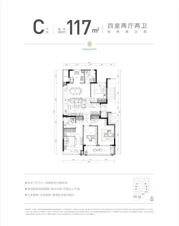 ①建面约117方户型新增了圆弧吊顶的设计,起到视觉延伸的作用,从而起到提升空间感;