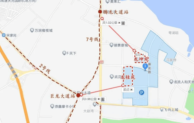 项目地块很大,主要说一下目前主推地块的交通,龙坤苑距离地铁7号线腾龙大道站直线距离约1公里,龙桂苑距离2号线和7号线换乘站巨龙大道站约900多米。