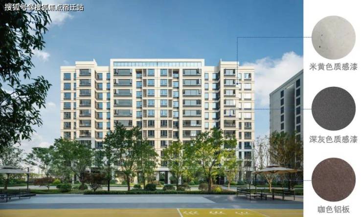 楼栋立面为现代风格体系,注重立面的对称,利用新材料和新结构的搭配,追求简洁现代美。材料的选择注重质感与色彩的统一,采用米黄为主、深灰为辅的色调建筑表皮,辅以简约边框设计,使立面更加简洁轻盈。