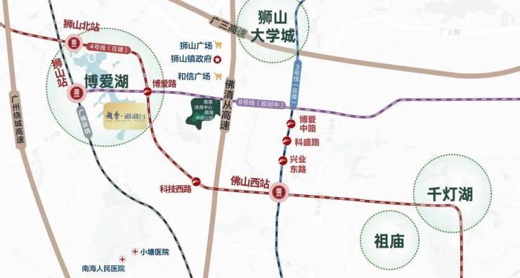 项目距离未来佛山地铁4号线、8号线博爱湖站800米,通达禅桂顺,距离城轨狮山站约900米,距离佛山西站约6公里,高铁到广州南站仅约20分钟,轻松融入大湾区1小时生活圈。