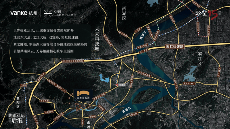 通过江滨东大道、彩虹快速路等便捷交通网络,与市中心无缝对接,仅需约20公里车程即可畅达滨江区,轻松融入杭州半小时经济生活圈。