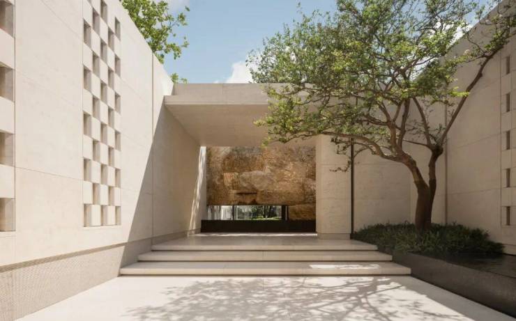 单扇就重达六七百斤的铜门,几乎是无声地滑开;以编织手法呈现的石材半透墙,带着几分东方含蓄;在门侧恭候你归家的,是百年老桩粉紫薇斜斜的树梢。