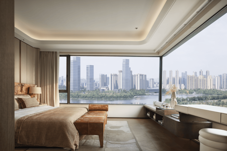 ·宽画幅主卧:超扁平宽度实现宽画幅观景,躺在床上,眼前是城市公园绿意,背后是千灯湖CAZ繁华天际