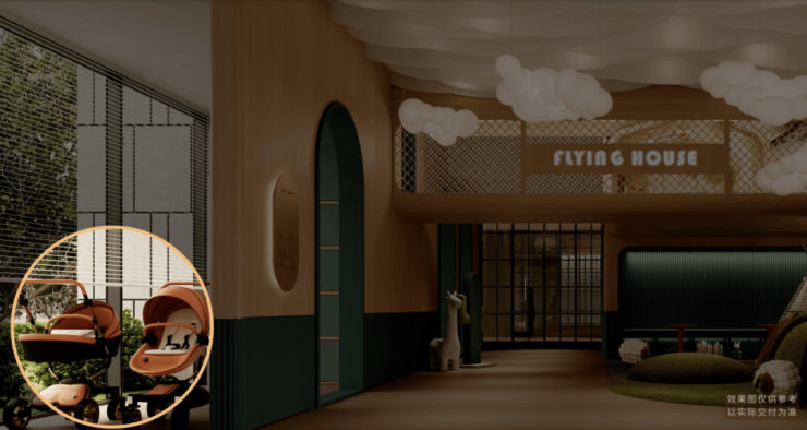室内娱乐区以飞屋环游记为主题,门旁边有专门一块空间给孩子们放滑板车、儿童车、小背包,这实际上是要告诉他们,当整个空间变得更加的有序的时候,孩子们的情绪也会变得更加的愉悦、更加的稳定,这就是空间所营造的邻里共融。