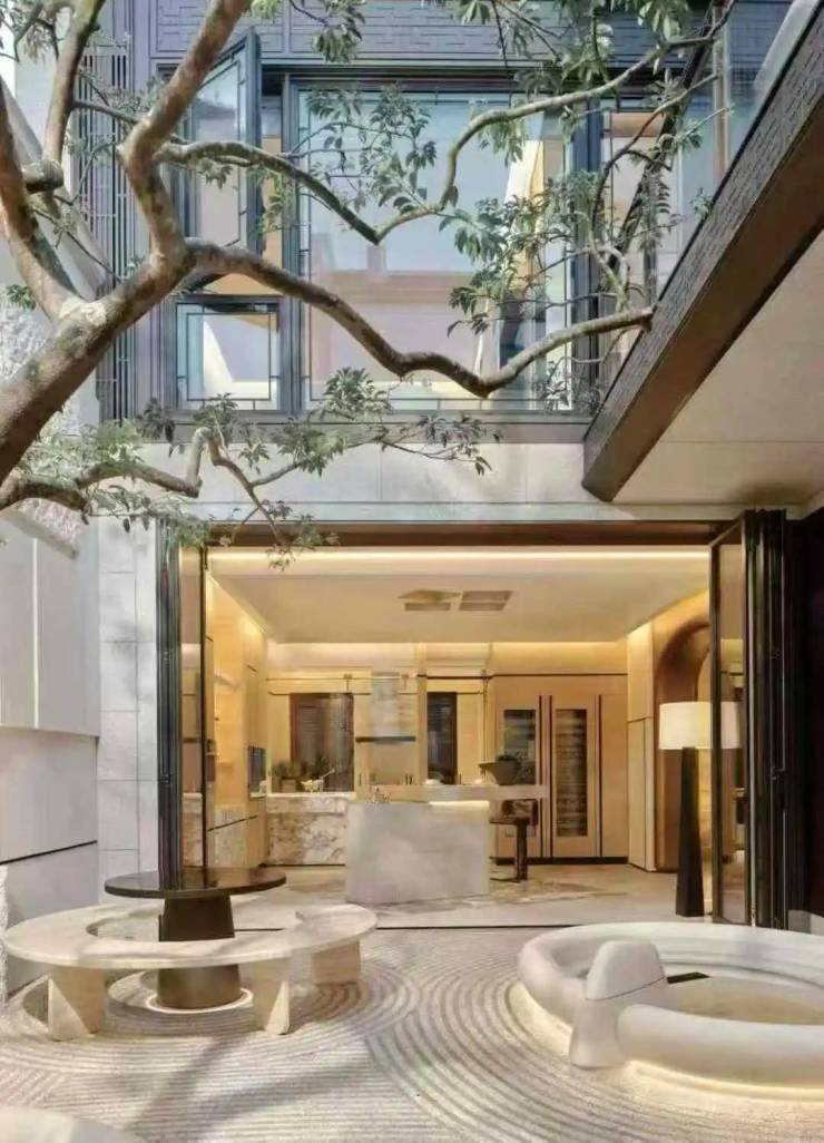 项目采用超大窗墙比设计,配合立体式庭院布局,最大化引入自然光线,同时保证每户的私密性。上层空间定义为“私密的美术馆”,剥离冗余装饰,以利落线条与朴质色块营造纯粹的栖居本质;顶层下午茶区以淡绿为底,壁炉暖光漫过手绘地毯,将社交场域沉淀为冥想容器,让艺术回归对生命体验的凝视。