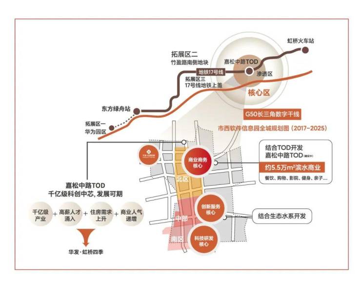 随着大虹桥科创功能西移发展的趋势,青浦新城基于“一城两翼,一带三核”发展战略目标,通过17号地铁线串联起三大核心节点,东起徐泾北斗产业基地,西到金泽华为研发基地,中部核心就是赵巷市西软件信息园,未来这条产业带上预期将会有数十万人口导入。