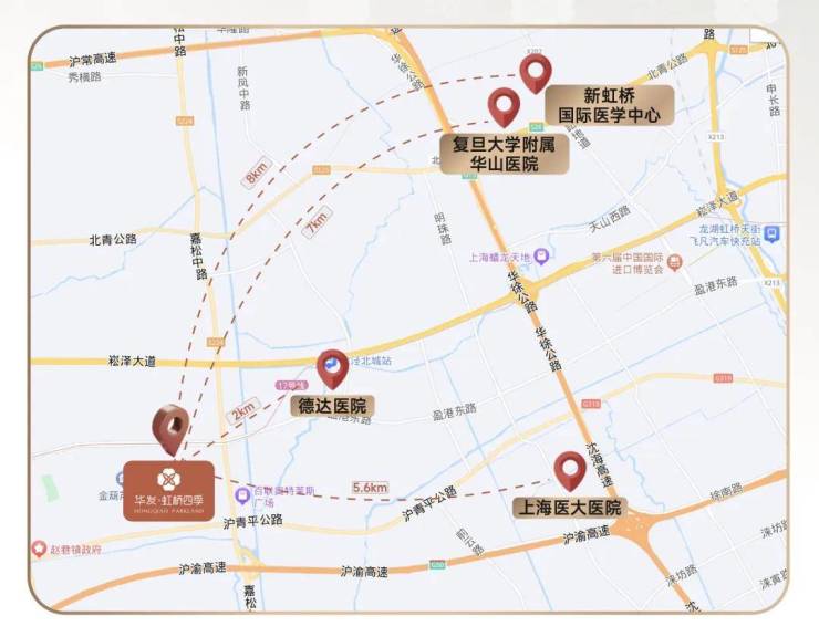 医疗方面,7公里内3家三级医院,约2公里到德达医院(三级私立医院)、约5.6公里到上海医大医院(三级综合)、约7公里到复旦大学附属华山医院(西虹桥分院)(三级甲等)