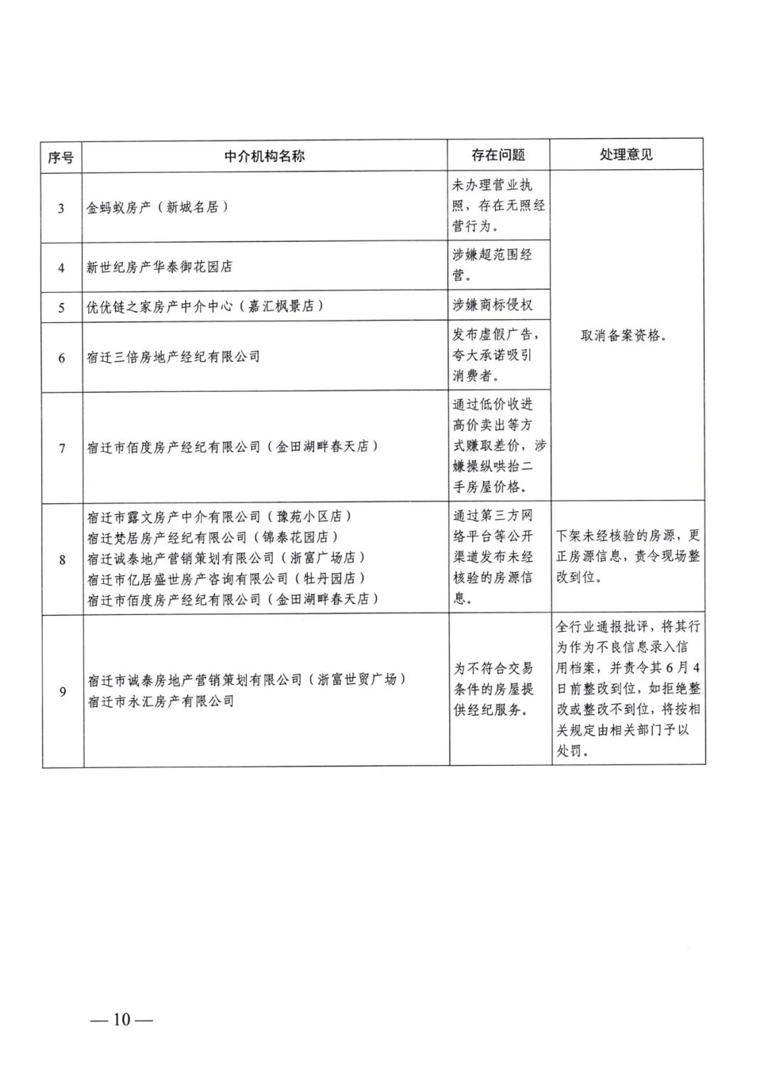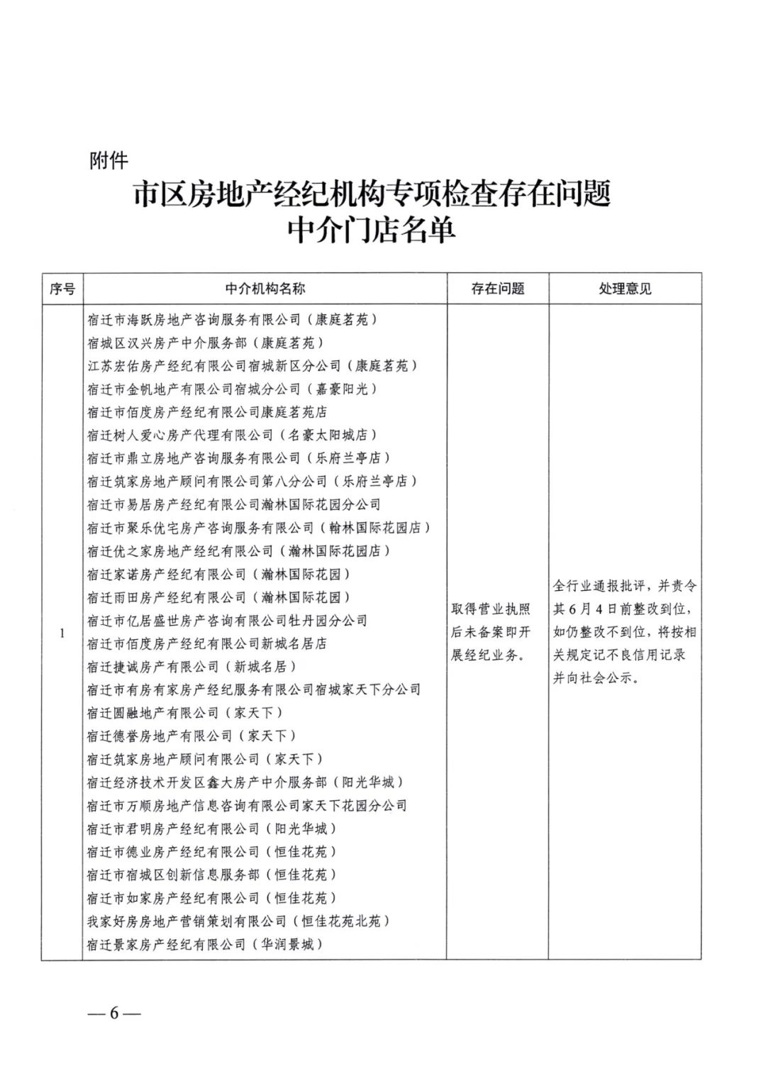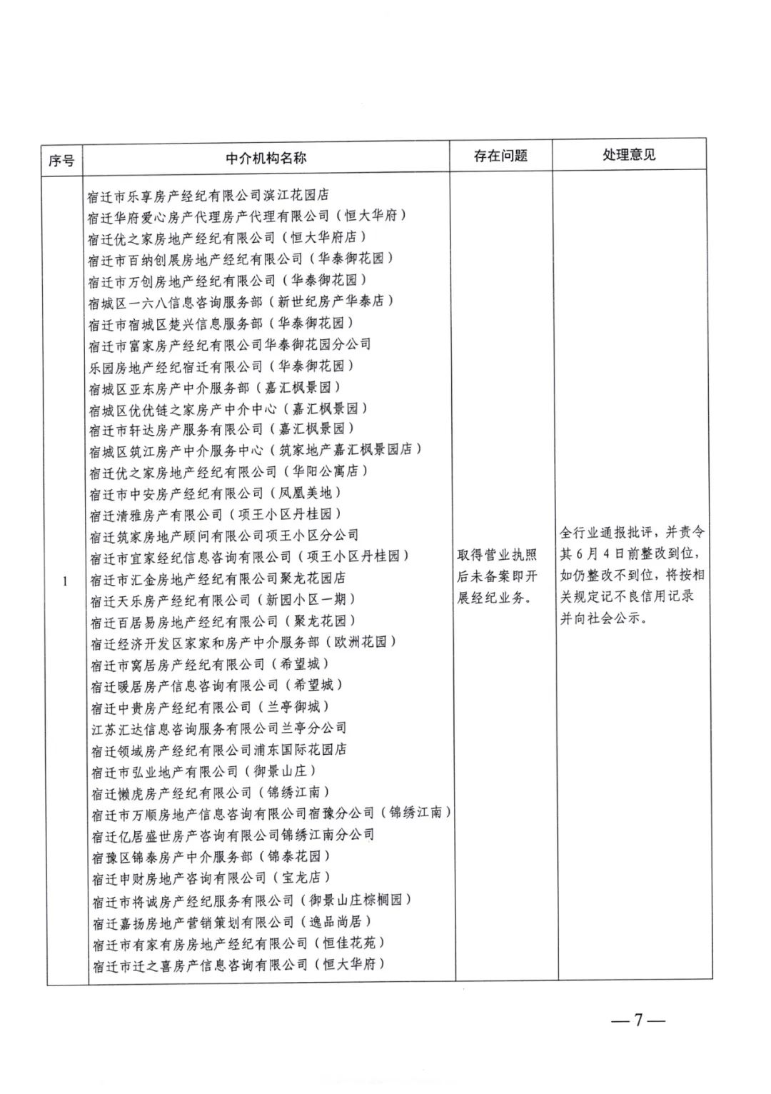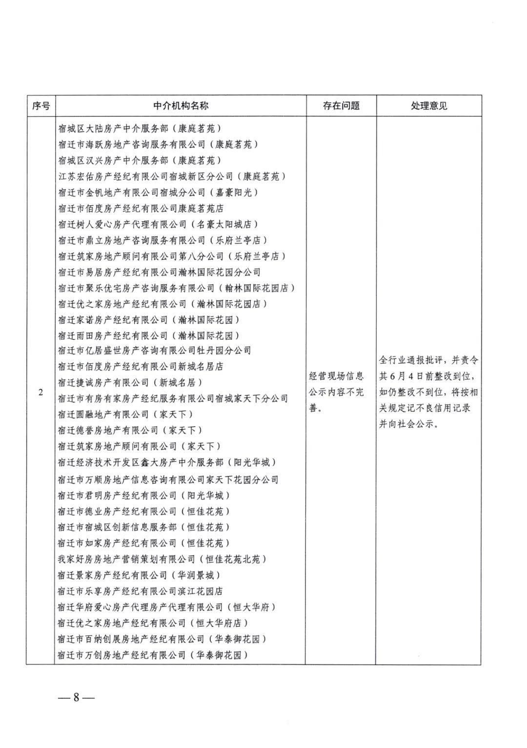 为进一步加强房地产中介机构市场监管,规范房地产中介机构市场行为,切实维护广大群众合法权益,根据《关于加强房地产中介管理促进行业健康发展的意见》、《房地产经纪管理办法》、《关于开展2021年排名前列季度房地产中介行业联合检查的通知》等文件精神,市住建局、市委网信办、市市场监管局、宿迁银保监分局于2021年4月下旬对市区房地产经纪机构的经营行为进行了专项检查,现将检查情况通报如下:基本情况本次检查内容为市区房地产中介服务门店备案情况、从业人员执业、现场信息公示以及经纪业务开展情况等内容。重点查处中介机构未按规定到房地产主管部门备案、经营场所公示内容不规范、发布虚假房源、低买高卖恶意炒房、签订“阴阳合同”非法规避房屋交易税费、为不符合交易条件的房屋提供中介服务等违法违规行为。本次共检查房地产中介服务门店82家,通过检查发现,宿迁市广电传媒有限公司(家天下店)、宿迁新纪元房产有限公司、宿迁吴姐房产中介有限公司等企业经营相对规范,现场公示内容相对齐全。但部分中介服务机构存在不规范经营行为,其中现场督促整改到位7家,现场下发整改通知书70份。市市场监督管理局对无证经营、涉嫌商标侵权等问题移交区市场监管局处理。市委网信办责令属地网站落实平台主体管理责任,加强对信息内容真实性的核查,全面清理不实房源信息。宿迁银保监分局随机抽取了部分存量房买卖合同、中介服务合同及补充协议、交易双方信息等,对可能存在金融机构提供或与其他机构合作提供房抵经营贷的资金流入房地产市场等问题线索进一步调查核实。存在问题(一)取得营业执照后未备案即开展经纪业务。本次检查共计发现37家门店未落实《房地产经纪管理办法》第十一条规定:“房地产经纪机构及其分支机构应当自领取营业执照之日起30日内,到所在直辖市、市、县人民政府建设(房地产)主管部门备案。”其中部分房地产经纪机构对分支机构的管理不到位,多数分支机构未进行备案。(二)经营现场信息公示内容不完善。部分中介门店未能按照《关于规范市区房地产经纪机构经营场所公示的通知》要求进行公示。部分中介机构无执业证件公示、无业务流程公示、无从业人员信息公示、公示内容与实际不相符等情况较为突出。如宿迁市将诚房产经纪服务有限公司、宿迁市有家有房房地产经纪有限公司等。(三)存在涉嫌违法违规开展经纪业务的行为。一是个别中介门店未办理营业执照,如金蚂蚁房产新城名居店。二是部分中介机构涉嫌超范围经营,如新世纪房产华泰御花园店。三是部分中介机构涉嫌商标侵权,如优优链之家房产中介中心(嘉汇枫景店)。四是部分中介门店通过发布虚假广告,夸大承诺吸引消费者,如三倍房产中介公开宣传“10天卖房、5天买房、当天租房”。五是部分中介机构通过低价收进高价卖出等方式赚取差价,不当获利,涉嫌操纵哄抬二手房屋价格,如宿迁市佰度房产经纪有限公司(金田湖畔春天店)。六是中介公司及从业人员通过第三方网络平台等公开渠道发布未经核验的房源信息,如宿迁市露文房产中介有限公司(豫苑小区店)等。七是个别经纪机构为不符合交易条件的房屋提供经纪服务,如宿迁市诚泰房地产营销策划有限公司、宿迁市永汇房产有限公司等。处理意见(一)对存在取得营业执照后、未经主管部门备案擅自开展房地产中介业务且经营现场信息公示内容不规范、不完善等问题的经纪机构及问题门店给予全行业通报批评,并责令其6月4日前整改到位,如仍整改不到位,将按相关规定记不良信用记录并向社会公示。(二)对存在无证经营、涉嫌超范围经营、涉嫌商标侵权以及通过低价收进高价卖出等方式赚取差价的经纪机构及问题门店取消备案资格。(三)对通过第三方网络平台发布未经核验的房源等行为的中介机构及从业人员进行全行业通报,检查组要求违规机构下架未经核验的房源,更正房源信息,责令现场整改到位。(四)对存在为不符合交易条件的房屋提供经纪服务的经纪机构及问题门店给予全行业通报批评,将其行为作为不良信息录入信用档案,并责令其6月4日前整改到位,如拒绝整改或整改不到位,将按相关规定由相关部门予以处罚。附件:市区房地产经纪机构专项检查存在问题中介门店名单 宿迁市住房和城乡建设局 中共宿迁市委网络安全 和信息化委员会办公室 宿迁市市场监督管理局 中国银行保险监督管理 委员会宿迁监督分局