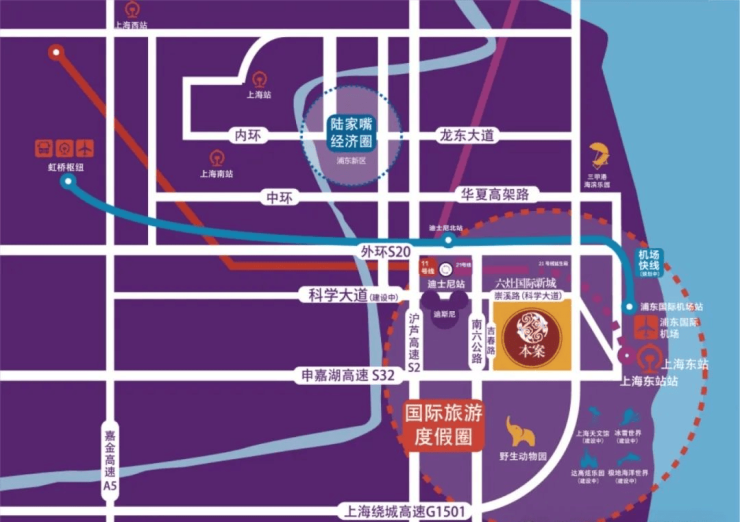一港四线环绕,外环;中环;申嘉湖高速;轨道交通11号、21号;浦东国际机场;项目门前的崇溪路改造后即科学大道,可直达未来的上海高铁东站(在建中)。